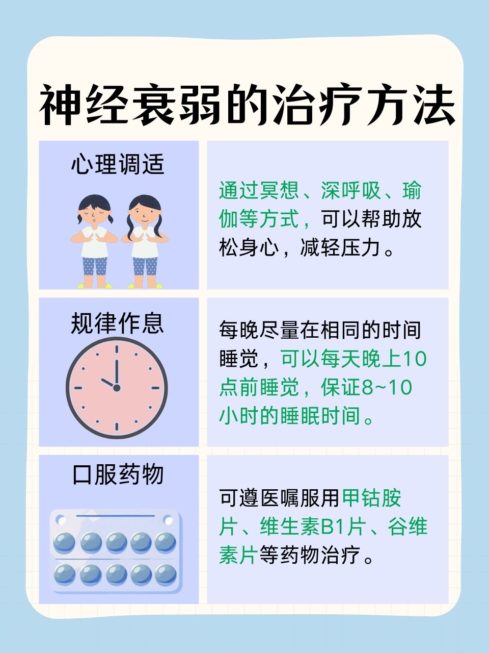 (1)藥物治療:在醫(yī)生建議下,可適當(dāng)服用一些調(diào)節(jié)神經(jīng)功能的藥物,如維生素B群、谷維素等。